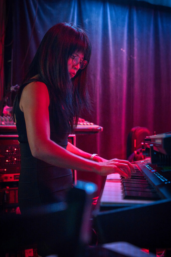 Caroline’s passion for music was rekindled by the neon glow of the ’80s, leading her to rediscover the piano through the electrifying sounds of The Cure, Erasure, Depeche Mode, and the iconic Brit pop era. Her performances are not just a feast for the ears but a spectacle for the eyes, as she can’t help but dance behind her keyboard, bringing an infectious energy that captivates audiences and bandmates alike.